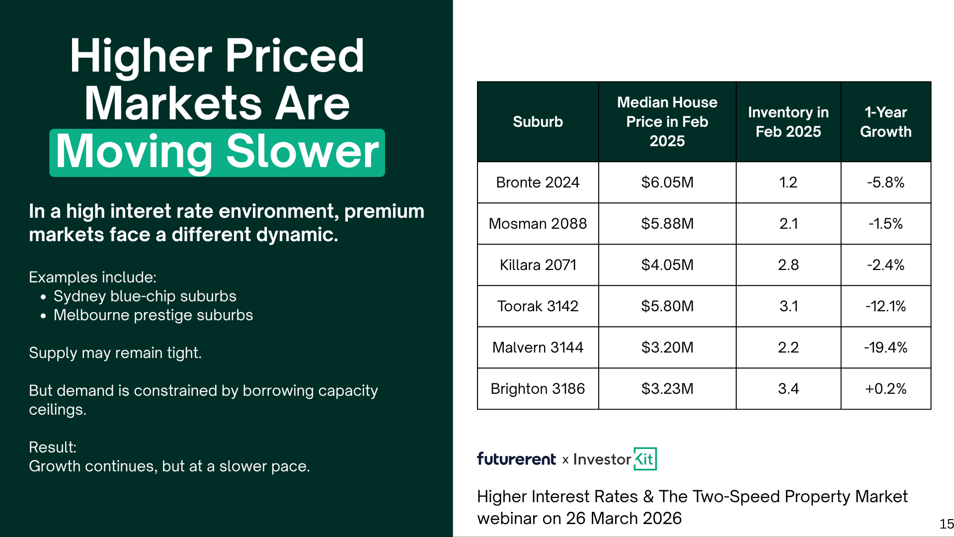 - Australia's market has split into two speeds since late 2022. Several premium suburbs are losing value, not just growing slowly.