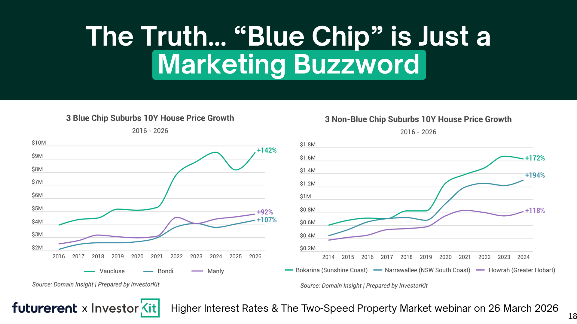 The data comparison in the session made the point sharply. Over the decade from 2016 to 2026, three well-known blue chip suburbs (Vaucluse +142%, Bondi +107%, Manly +92%) were tracked against three non-blue-chip suburbs: Bokarina on the Sunshine Coast (+172%), Narrawallee on the NSW South Coast (+194%), and Howrah in Greater Hobart (+118%). The non-blue-chip markets outperformed, at a fraction of the entry price.