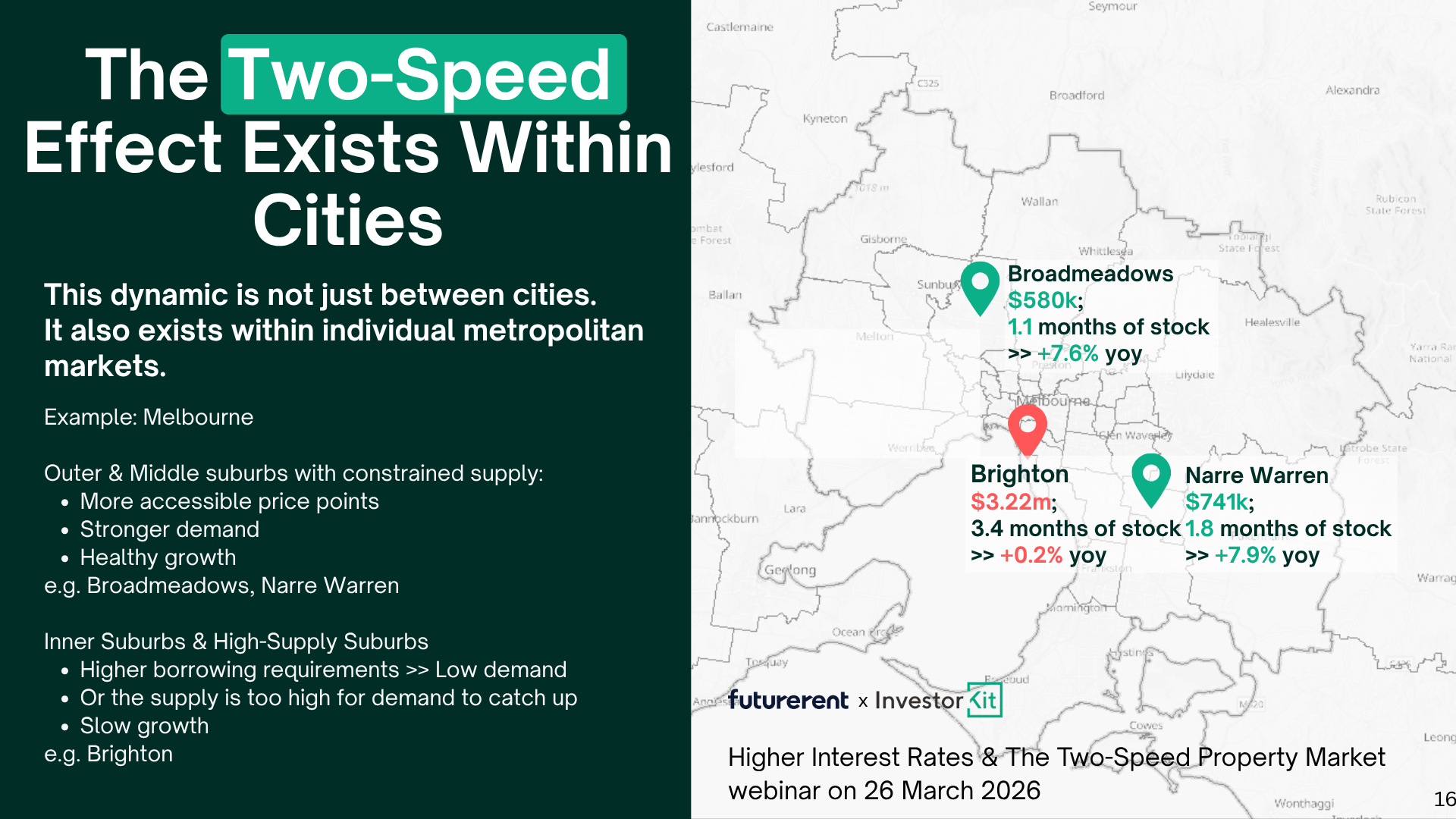 This matters because investors who write off an entire city based on headline figures can miss strong pockets within it. The question to ask is not "is Melbourne performing?" but "which parts of Melbourne have the supply, demand and affordability dynamics that drive growth?"
