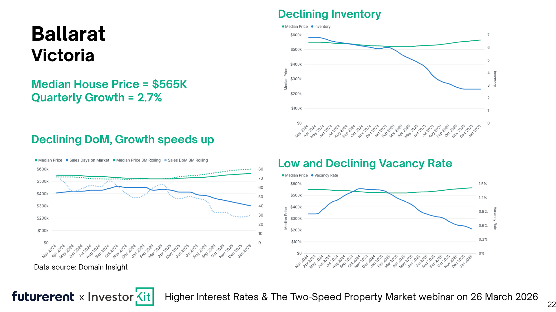 Ballarat, VIC (median house price $565K) illustrates the importance of looking past state-level narratives. While Victoria's land taxes and state debt generate constant commentary, Ballarat is running at similar quarterly growth rates, with inventory at roughly half its level from the prior year and vacancy rates near zero. Affordable entry points with houses starting in the low-to-mid $500Ks.