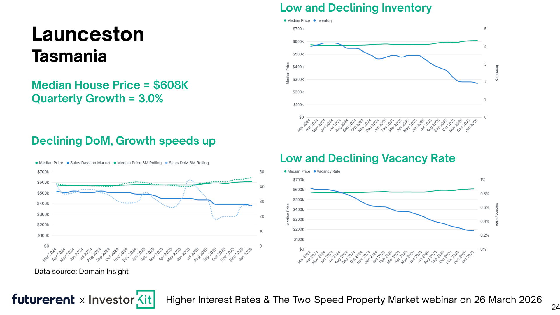 Launceston, Tasmania (median house price $608K) shows similar characteristics: 3% quarterly growth, near-zero vacancy rates, and inventory declining consistently.