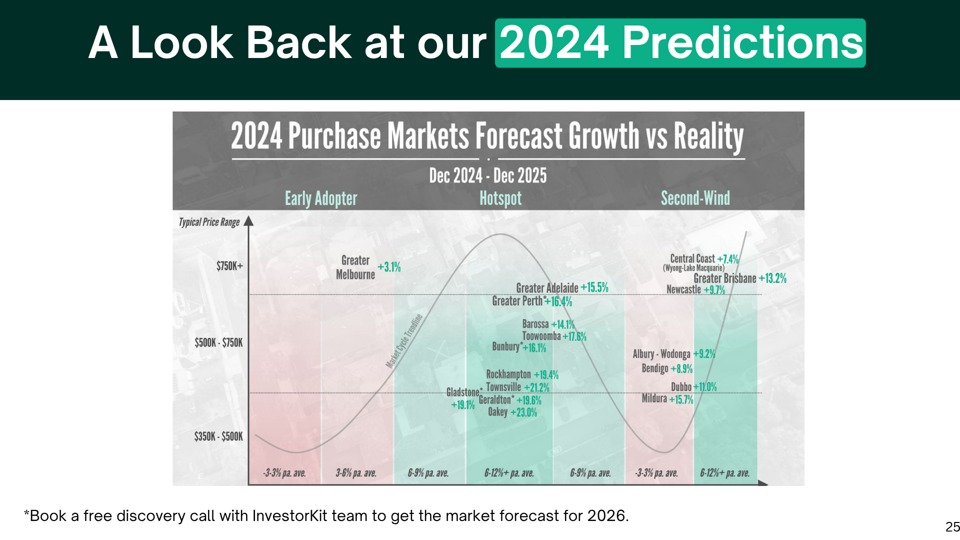 The proof that this framework holds up isn't theoretical. In December 2024, these same market cycle categories were used to forecast what would happen over the following 12 months. Markets flagged as hotspots hit 12%+ growth. Markets flagged as early adopters came in at 3–6%. Markets called as slow, like Greater Melbourne at 3.1%, delivered exactly that. The framework predicted not just the outperformers, but also which markets would be quiet, and it was right across the board.