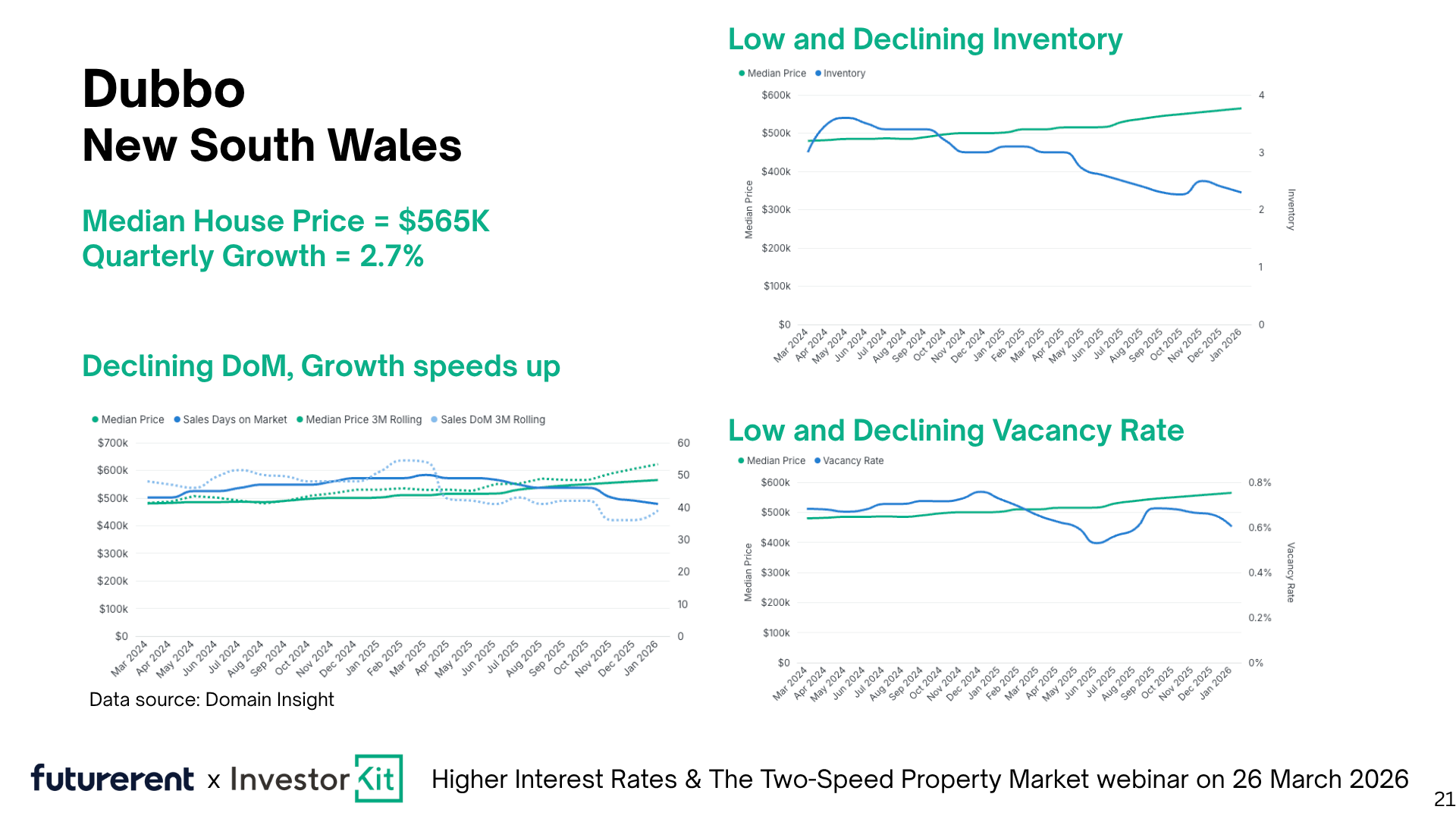 Dubbo, NSW (median house price $565K) is running at 2.7% quarterly growth, annualising well into double digits. Days on market are falling fast. Vacancy rates are low and declining. Housing inventory is suppressed. The local economy is diversified, unemployment is below national averages, and infrastructure spend per capita is high. Regional migration from capital cities, a trend that accelerated during COVID and has not reversed, continues to support demand.