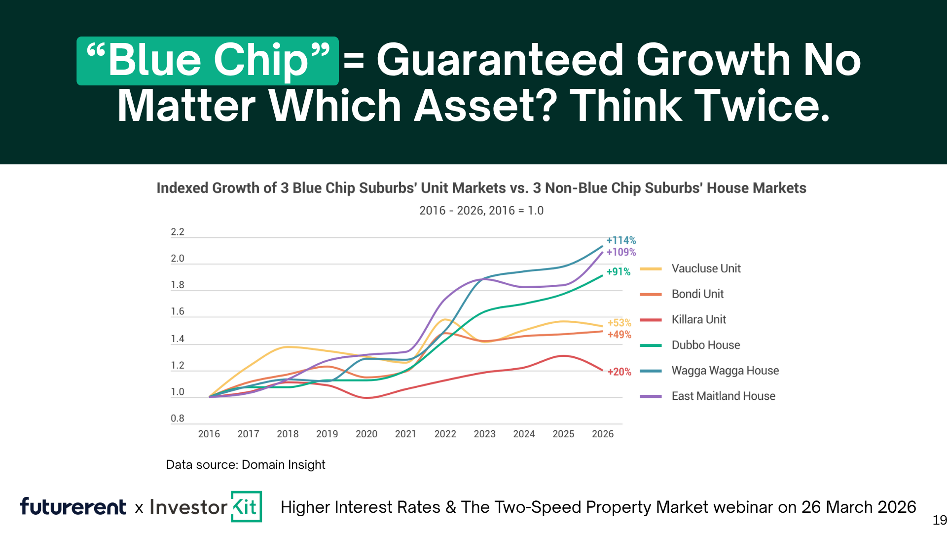 When you buy a blue chip unit to get into a premium location at a more accessible price, you also take on strata risk, body corporate costs, and supply risk from new development. A house in a growth regional or outer metro market, at a similar or lower budget, often avoids all of those while delivering stronger returns.