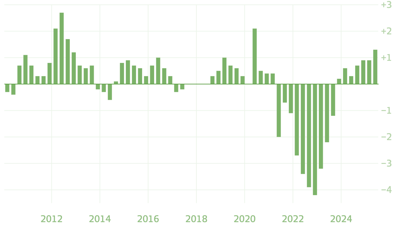 Economic fundamentals continue supporting buyer capacity. Real wages growth stands at 1.3% as of June, the highest level in years and about 2½ times the pre-COVID decade average of just 0.5%. This represents genuine purchasing power improvement rather than inflation-driven nominal increases.